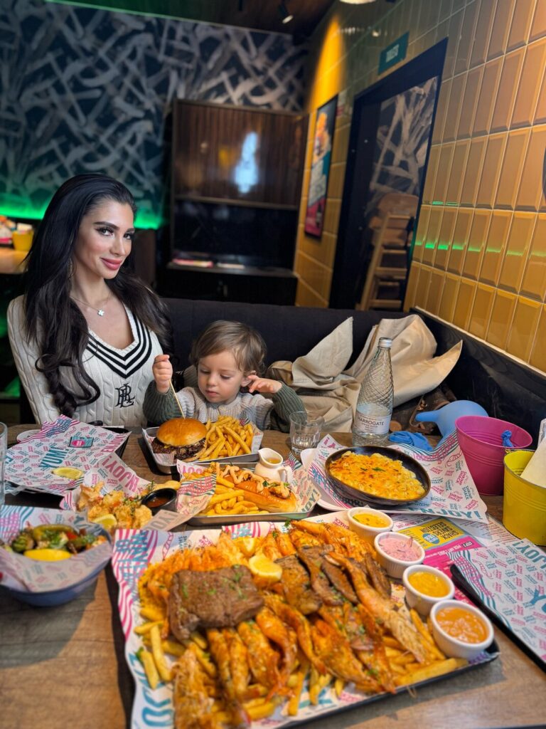 Our table made the most of it. Joe went straight for the Surf & Turf — an 8oz wagyu steak paired with four prince shrimps — and declared it one of the best-value plates he’d had in ages. My wife opted for the Grilled Salmon with prince shrimps, beautifully cooked and seasoned with a precision that surprised us all. I chose the Battered Fish & Shrimps, a golden, crisp, deeply satisfying plate that tasted like it had come straight from a seaside shack rather than a bustling London high street. Even Xavier, who is currently in his “throw food before eating it” phase, paused long enough to enjoy a few bites of perfectly seasoned fries.
